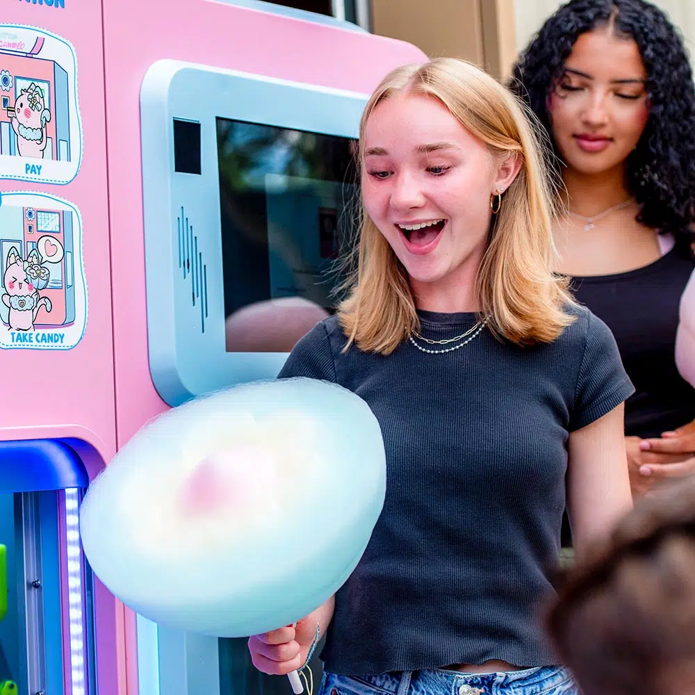 Children will delight in customizing their own cotton candy on the large 21” touchscreen, choosing from 60 different flower designs in 4 colors and flavors. The internal robot then crafts the cotton candy right before their eyes, creating a mesmerizing experience that keeps them coming back for more.